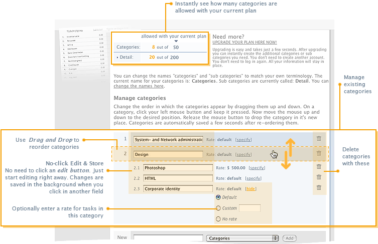 For instance when you have a category Design you could have Corporate Identity, User Interface, Ergonomics, Website Layout and Review as sub categories. This would allow you to report in great detail what kind of design work you have been working on for your client.