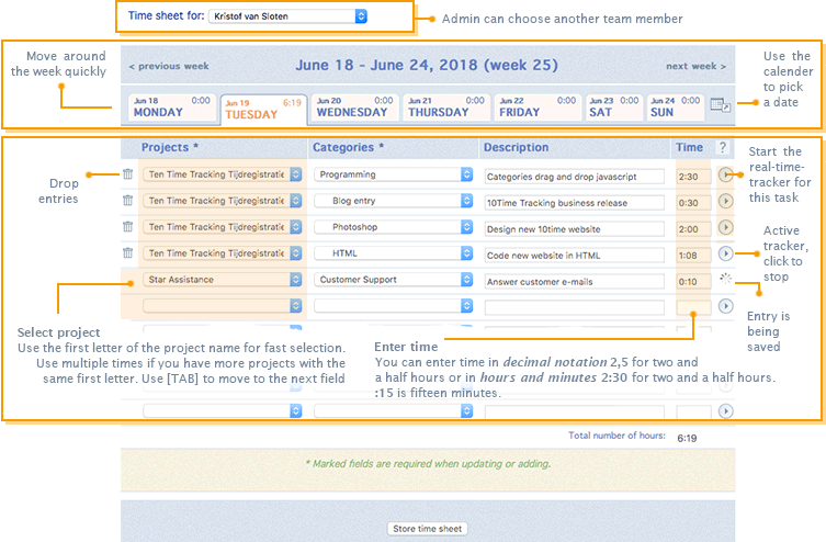 - Uren kunnen invoeren in hele uren en delen van uren (1.5) en in uren en minuten (1:30 of zelfs :90).